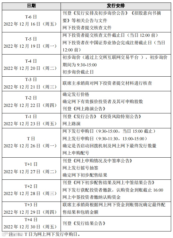 安排上,12月20日(T-4日)9:30-15:00为此次发行初步询价时间,12月22日(T-2日)确定发行价格及网下有效报价投资者及其可申购股数,12月23日(T-1日)进行网上路演,12月26日(T日)为申购日,其中网下发行申购时间为当日9:30-15:00,网上发行申购日时间为当日9:30-11:30和13:00-15:00。