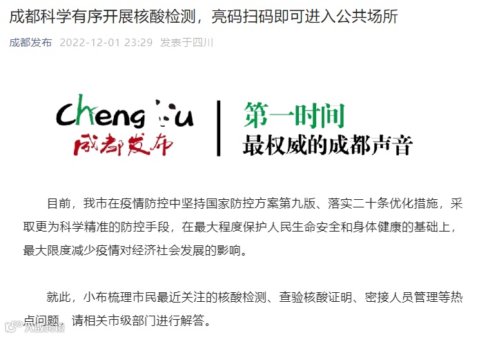 成都:亮码扫码即可进入公共场所!隔离政策、封控时长等,最新回应!腰斩股暴涨30%,什么情况?
