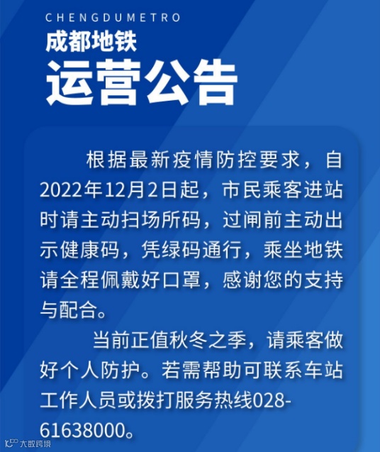 成都地铁官方微博表示,根据最新疫情防控要求,自2022年12月2日起,市民乘客进站时请主动扫场所码,过闸前主动出示健康码,凭绿码通行,乘坐地铁请全程佩戴好口罩。