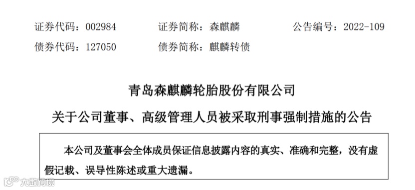 公告显示,森麒麟董事会于12月9日收到公司董事、财务总监许华山女士家属的通知,许华山因入职森麒麟前的相关工作问题被海南省儋州市公安局采取刑事强制措施,目前相关案件尚待公安机关进一步调查。