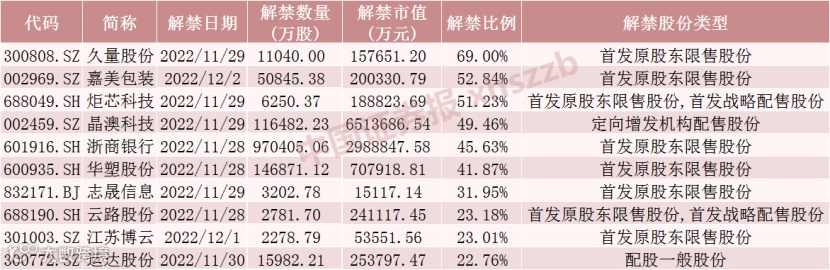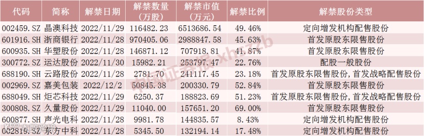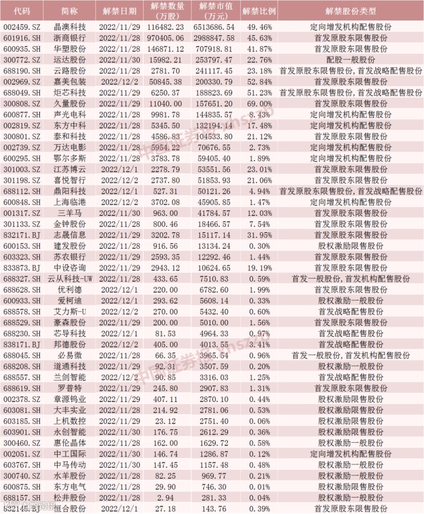 具体来看,晶澳科技11月29日将解禁11.65亿股,均为定向增发机构配售股份。浙商银行11月28日将解禁97.04亿股,均为首发原股东限售股份。华塑股份11月28日将解禁14.69亿股,均为首发原股东限售股份。