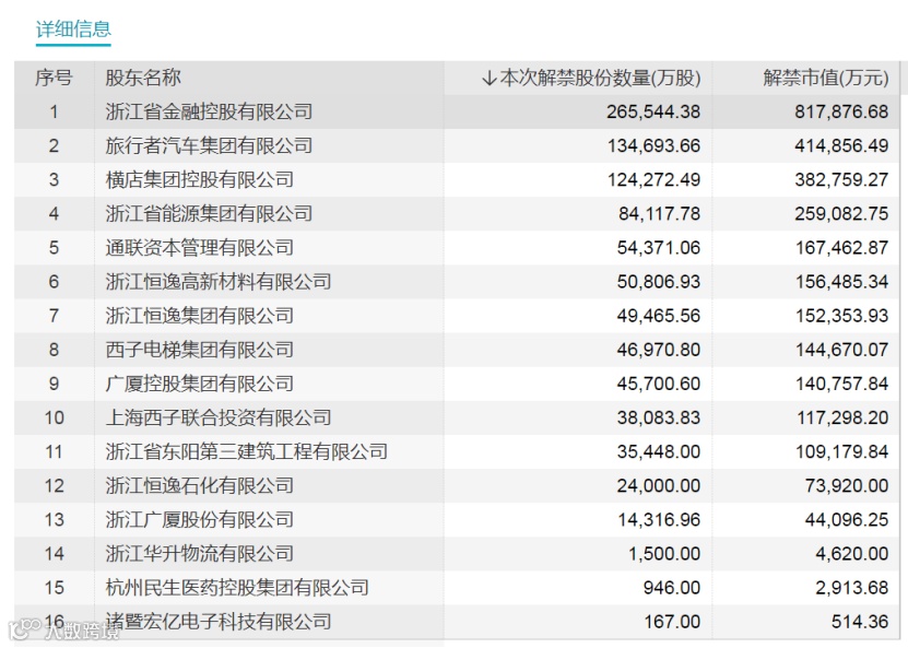 浙商银行下周解禁股东为浙江省金融控股有限公司、旅行者汽车集团有限公司、横店集团控股有限公司等16个股东,其中浙江省金融控股有限公司为浙商银行第二大股东。