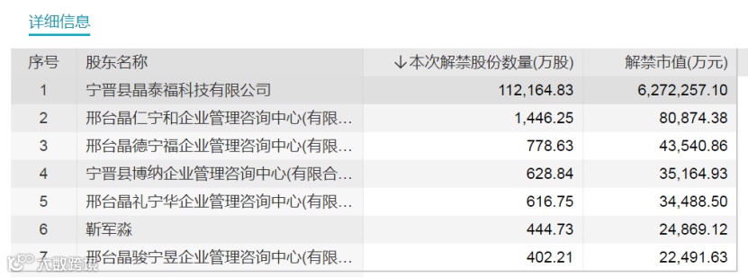 具体来看,解禁市值最大的晶澳科技为光伏组件龙头股,解禁股东为东台市晶泰福科技有限公司(曾用名宁晋县晶泰福科技有限公司)、