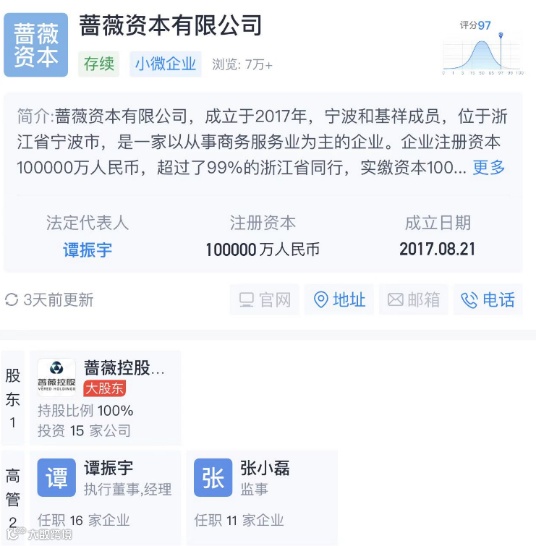 天眼查数据显示,蔷薇资本成立于2017年,企业注册资本10亿元,为蔷薇控股全资子公司,对外投有田中精机、达志科技等公司。Wind数据显示,截至三季度末,蔷薇资本仍为田中精机、达志科技前十大股东。其中持有田中精机 986.75万股,占总股本7.57%,为第五大股东;另持有达志科技509.43万股,占总股本509.43万股,占总股本3.22%,为第四大股东。
