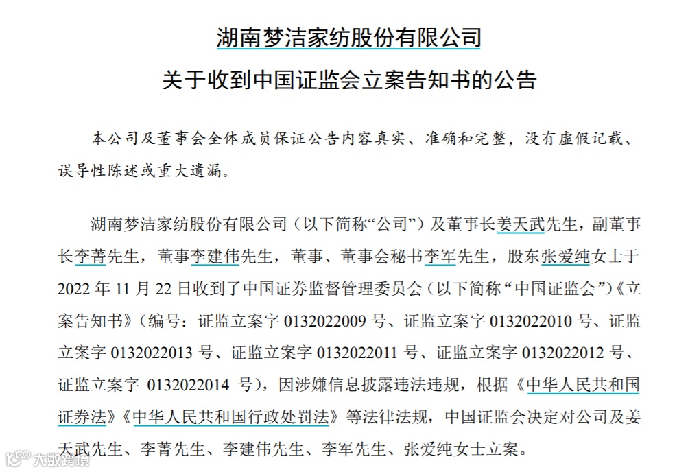 梦洁股份11月23日晚间公告,因涉嫌信息披露违法违规,根据法律法规,中国证监会决定对公司及董事长姜天武,副董事长李菁,董事李建伟,董事、董事会秘书李军,股东张爱纯立案。
