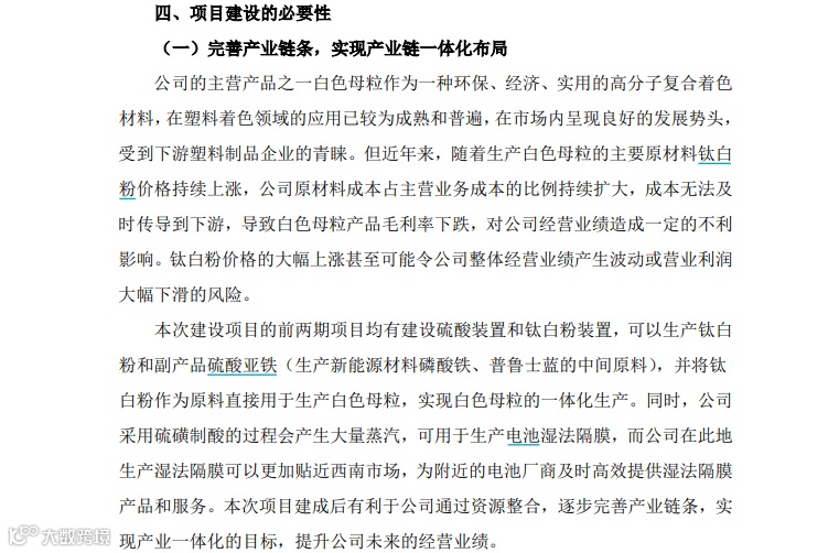 具体来看,一期预计投资30亿元,建设年产90万吨硫酸装置、年产20万吨钛白粉装置,年产30万吨高端塑料色母粒、60万吨硫酸亚铁;二期预计投资45亿元,建设年产120万吨硫酸装置、年产30万吨钛白粉装置,年产50万吨高端塑料色母粒、90万吨硫酸亚铁;三期预计投资25亿元,建设15亿平方米动力锂电池隔膜生产线。