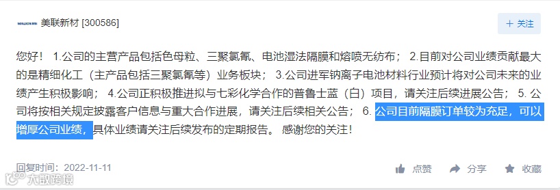 美联新材11月11日在互动平台表示,公司目前隔膜订单较为充足,可以增厚公司业绩。