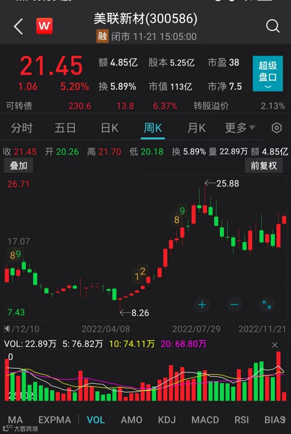 11月21日收盘,美联新材股价报21.45元/股,市值113亿元。