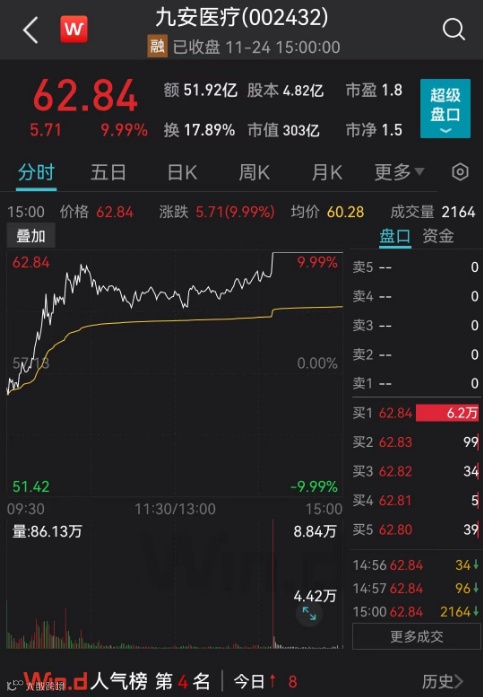 Wind数据显示,今日主力资金净流入九安医疗12.66亿元,仅次于以岭药业,位居两市第二名;今日A股成交额第二名,也是九安医疗,为51.92亿元。