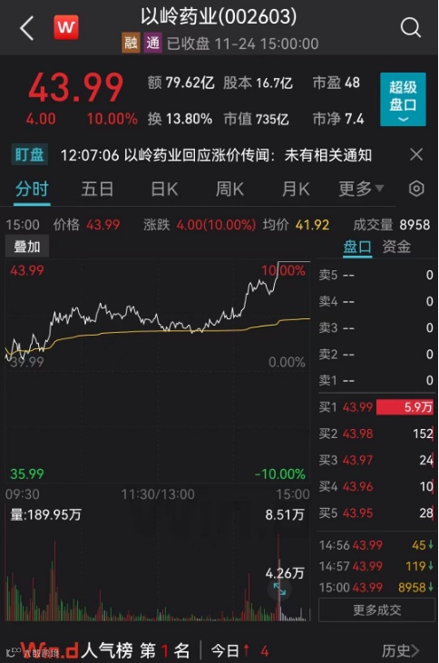 昨日大跌的“石家庄茅台”以岭药业,今日尾盘涨停,全天成交额高达79.62亿元,再度占据A股股票成交额榜首。Wind数据显示,在今日的主力资金净流入榜单上,以岭药业也高居榜首,达13.48亿元;北向资金今日净买入以岭药业1.38亿元。