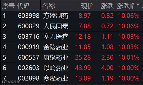 本周以来连续调整的医药板,今日终于扭转颓势,上演涨停潮。截至收盘,科兴制药涨逾10%,方盛制药、人民同泰、塞力医疗、金陵药业、康缘药业、赛隆药业等均涨停。