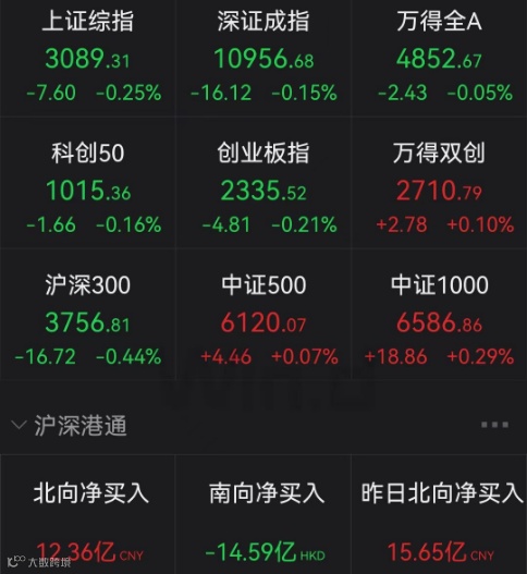 11月24日A股高开后震荡回落,三大指数均小幅下跌。截至收盘,沪指跌0.25%,深成指跌0.15%,创业板指跌0.21%。两市超2600只个股上涨,合计成交7481亿元。北向资金全天净买入12.36亿元,其中沪股通净买入22.17亿元,深股通净卖出9.81亿元。