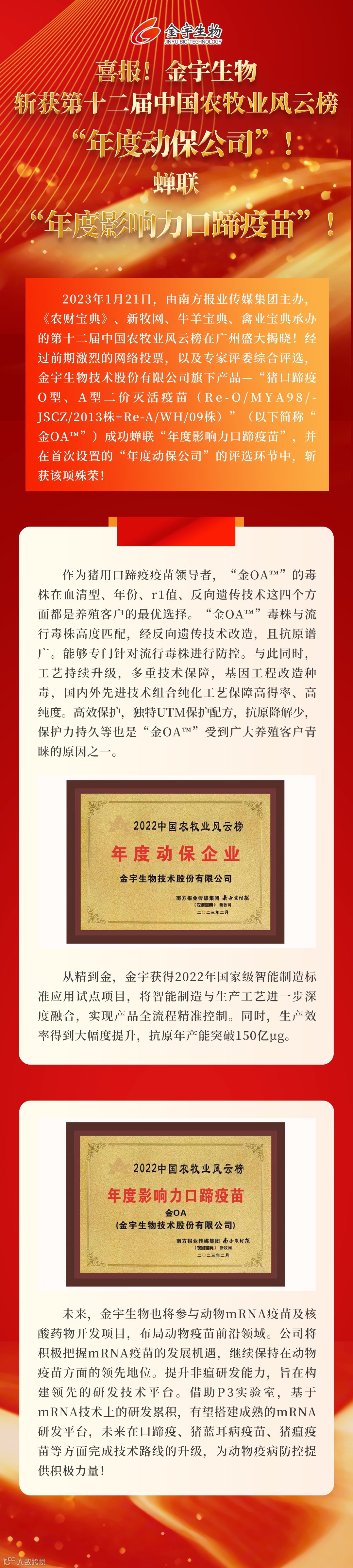 金宇生物斩获第十二届中国农牧业风云榜“年度动保公司”!