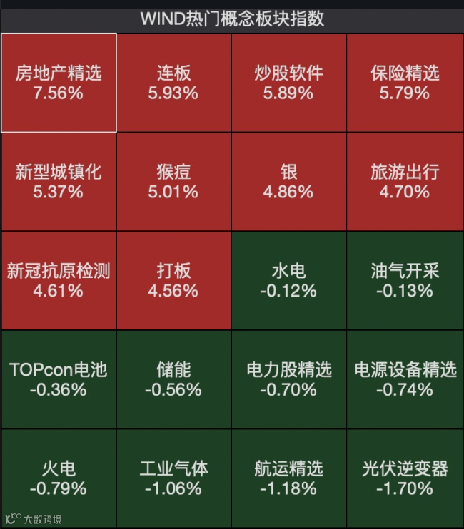 截至上午收盘,Wind热门概念板块指数中,房地产精选涨幅为7.56%,在所有板块中涨幅居前。多只地产股涨停,其中,金科股份涨10.14%,华侨城A涨10.08%,绿地控股涨10.03%,万科A、新城控股、华发股份、南山控股分别涨9.99%、9.98%、9.98%、9.97%,该板块的21只股票全线收涨。