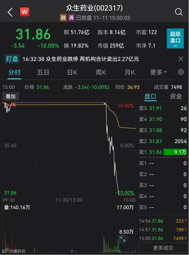 截至收盘,众生药业报每股31.86元,下跌10%,换手率为19.82%,最新市值259亿元。值得注意的是,当天成交也放出天量,全天共成交51.76亿元。截至收盘,仍有9.1万手卖单牢牢封死跌停。