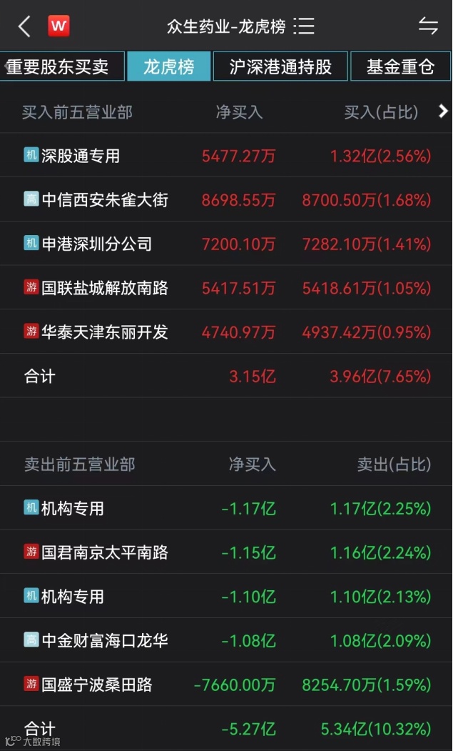 因涨跌幅偏离达7%及振幅达15%,11月11日众生药业再度现身龙虎榜。数据显示,当天买入金额最大的前5家营业部合计买入3.96亿元,卖出金额最大的前5家营业部合计卖出5.34亿元,净卖出额2.12亿元。