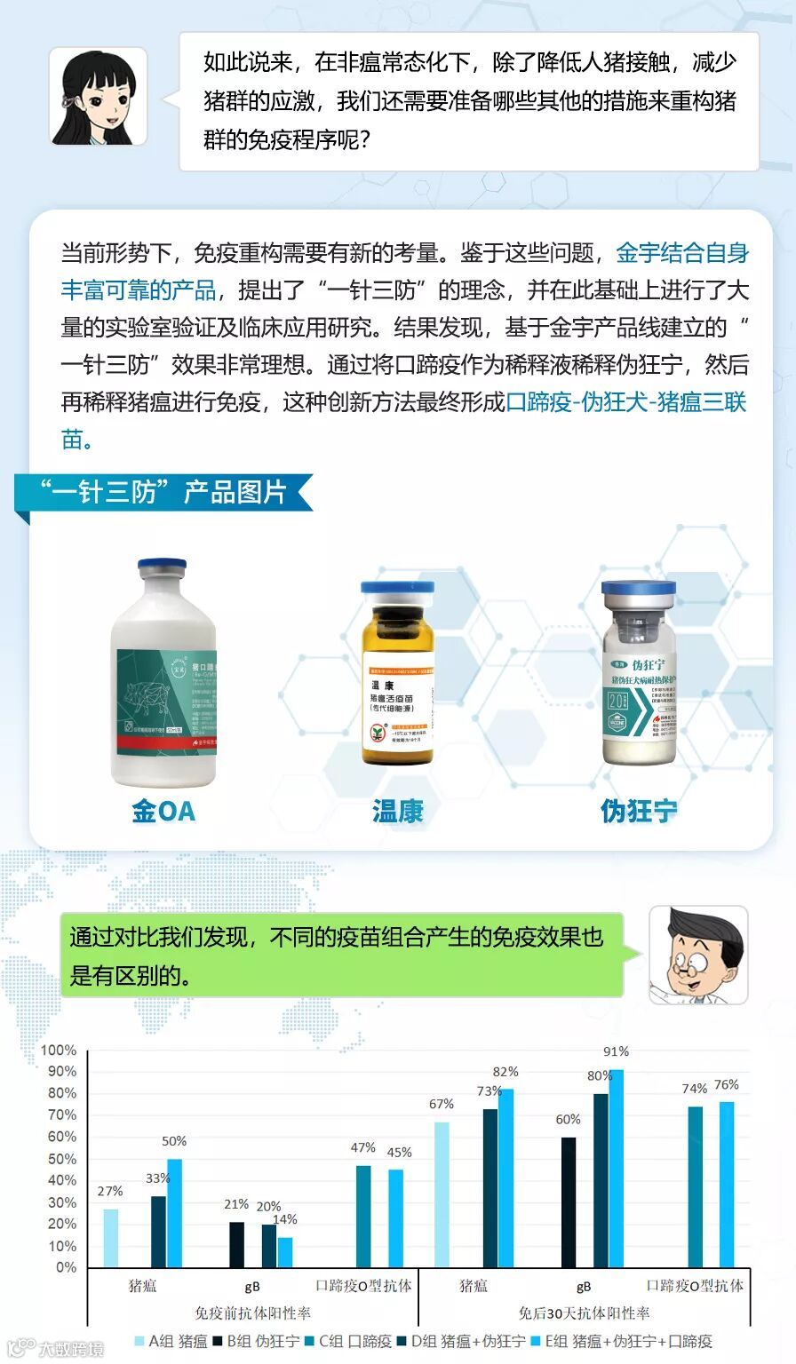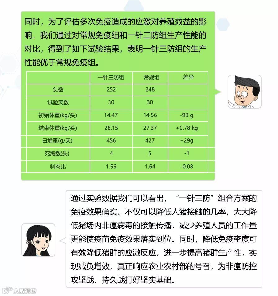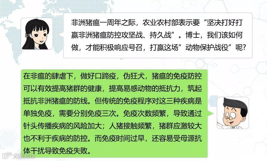 有研究表明,相同感染剂量下,液体组和饲料组随着暴露次数增加,非洲猪瘟的感染几率也随之增加。当液体组的暴露次数达到10次时,最低感染剂量(1 TCID50)的感染几率接近1。由此可见,减少免疫次数的同时减少人猪接触的次数,可以减低针头传播疾病的风险,又能大大降低非洲猪瘟感染的几率。