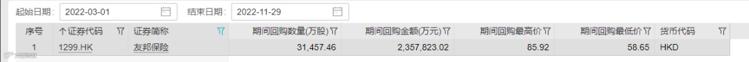 11月28日晚,友邦保险在港交所公告,公司于11月28日,通过集中竞价交易回购314万股,回购金额2.25亿港元。