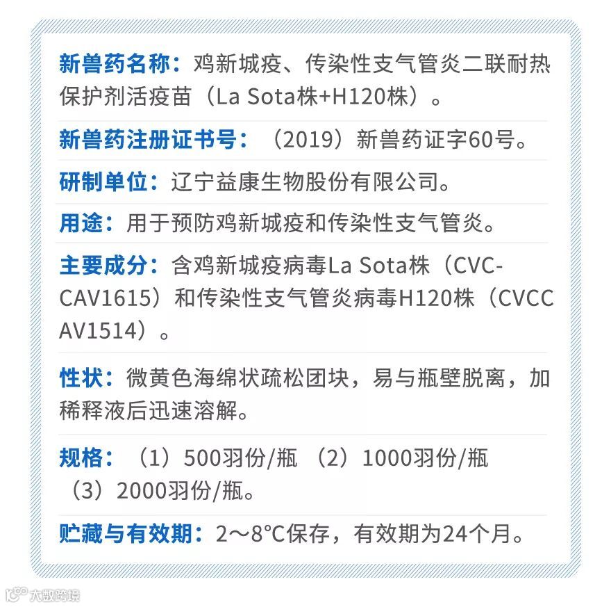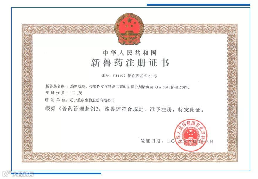 经农业农村部审查,金宇生物技术股份有限公司(以下简称“金宇生物”)控股子公司辽宁益康生物股份有限公司(以下简称“辽宁益康”)自主研发的鸡新城疫、传染性支气管炎二联耐热保护剂活疫苗(La Sota株+H120株)已获批为新兽药,并取得了《新兽药注册证书》[(2019)新兽药证字60号]。