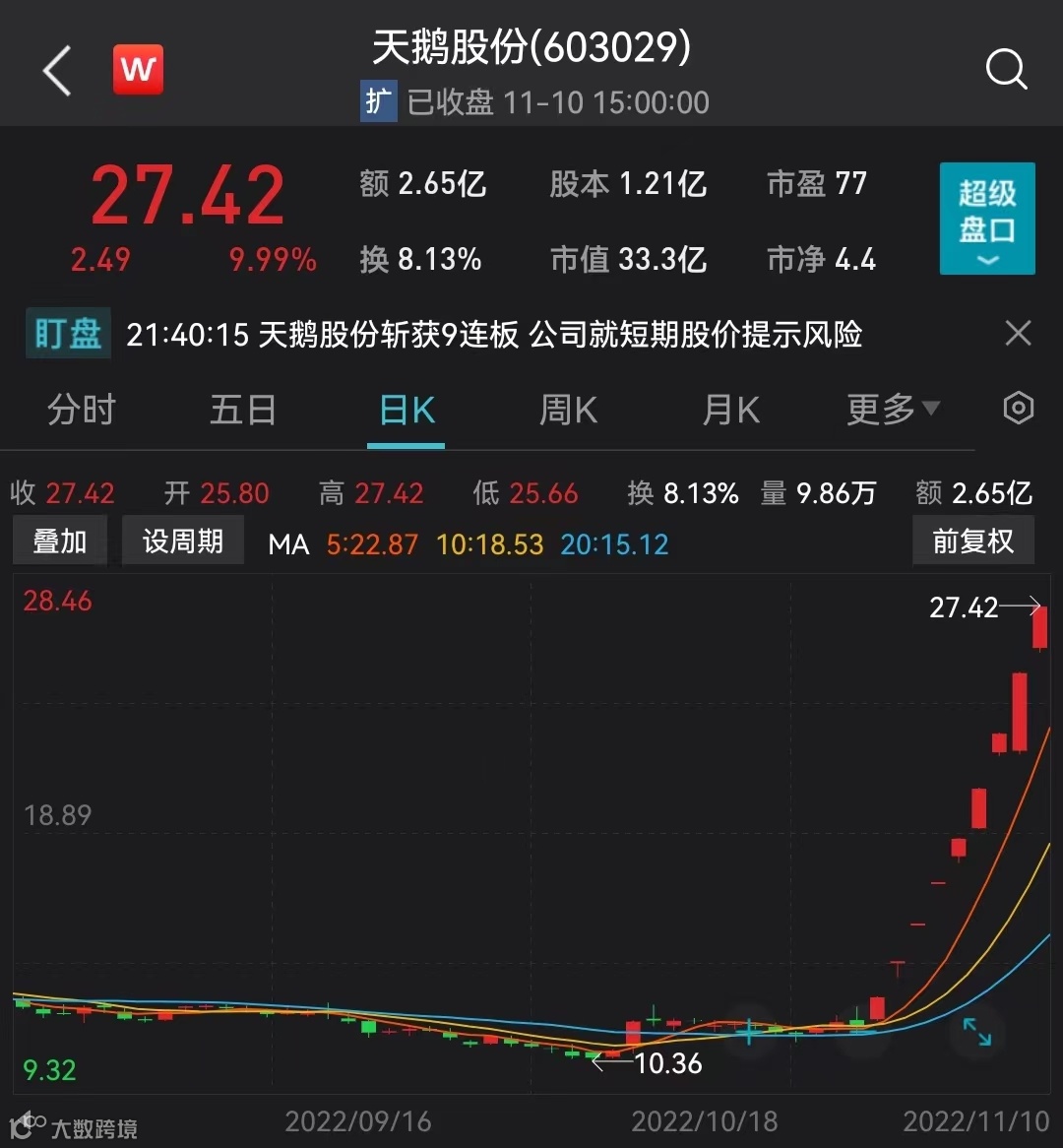 11月10日,天鹅股份再度强势涨停。10月28日以来,公司股价连续9个交易日涨停,累计涨幅高达135.77%。