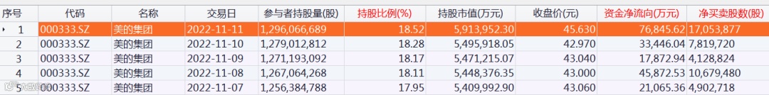 从成交均价和加仓股数来计算,美的集团为本周北向资金增持金额最大的股票,增持美的集团4458.46万股,加仓金额达19.51亿元。从明细数据来看,本周北向资金连续5个交易日加仓美的集团,其中11月11日加仓超7亿元。