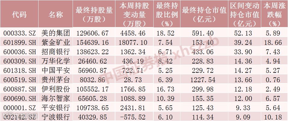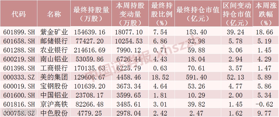 从市场表现看,本周北向资金持仓市值增加额居前十的股票均上涨,紫金矿业涨幅最大。