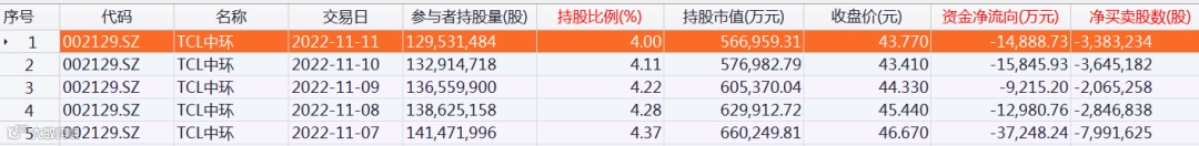 从成交均价和减仓股数来计算,TCL中环为本周北向资金减仓金额最大的个股,共被减仓1993.21万股,金额达9.02亿元。从明细数据来看,本周北向资金连续5个交易日减仓TCL中环,其中11月7日减仓超3亿元。