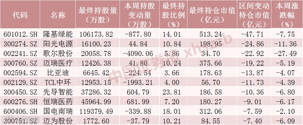 本周持仓市值减少额居前十的股票中,除阳光电源、迈瑞医疗、先导智能、恒瑞医药被北向资金分别加仓44.84万股、41.80万股、604.79万股、681.99万股外,其他股票均被北向资金减仓。其中,歌尔股份、TCL中环被减仓超1000万股。