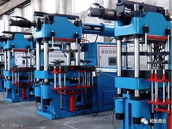 生胎被装到硫化机上,在模具里经过适当的时间以及适宜的条件,从而硫化成成品轮胎。硫化完的轮胎即具备了成品轮胎的外观—图案/字体以及胎面花纹。现在,轮胎将被送到最终检验区域了。