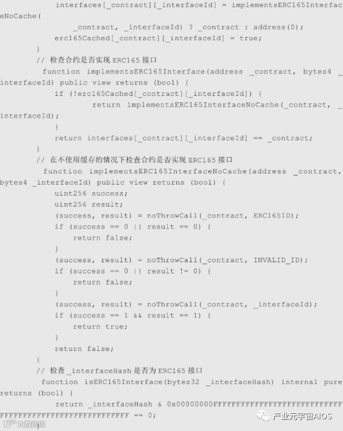 实现ERC165标准的合约可以通过supportsInterface接口来查询它是否实现了某个函数,函数的参数interfaceID是函数选择器(参考第7章),当合约实现了函数选择器对应的函数,supportsInterface接口需要返回true,否则为false(特殊情况下,如果参数interfaceID为0xffffffff,也需要返回false)。