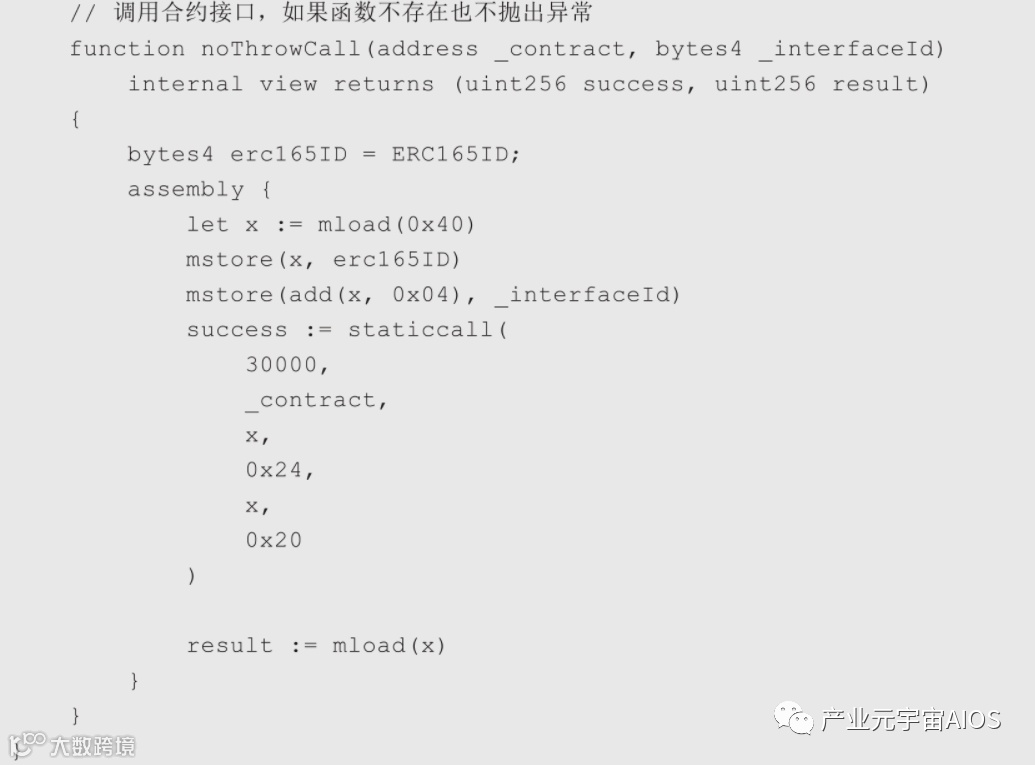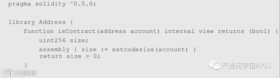 Address.sol使用了第7章介绍的内联汇编来实现,extcodesize函数取得输入参数account地址所关联的EVM代码的字节码长度,因为只有合约账户才有对应的字节码,其长度才大于0。