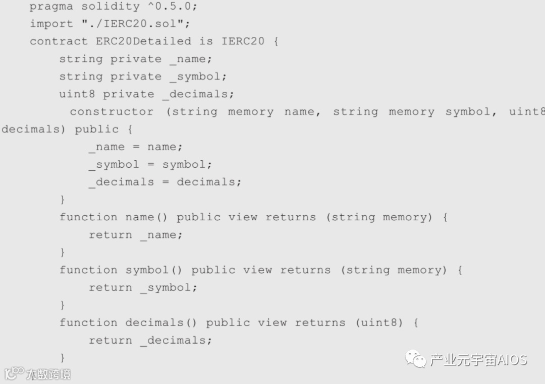 ERC20Detailed的实现比较简单,仅仅初始化代币名称、代币符号、小数位数这3个变量,代码如下: