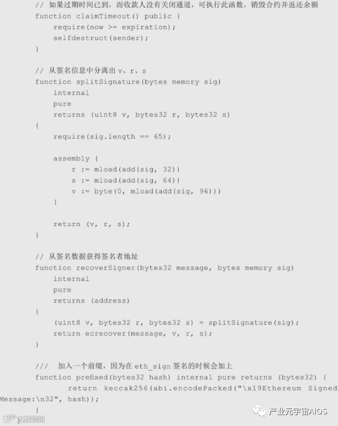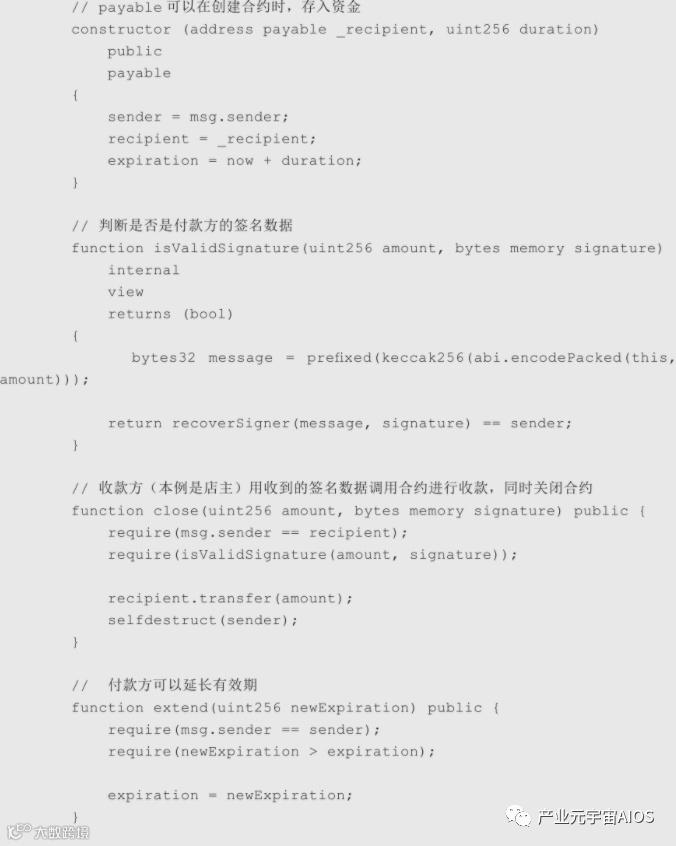 小明在创建合约时,就需要打入以太币,因此constructor()构造函数需要用payable修饰,小明支付咖啡费是通过转给店主一个签名的信息(就像小明给了一张签名的支票到店主一样,下一节会介绍如何进行支付签名),然后店主使用签名信息调用合约的close()函数进行提款。