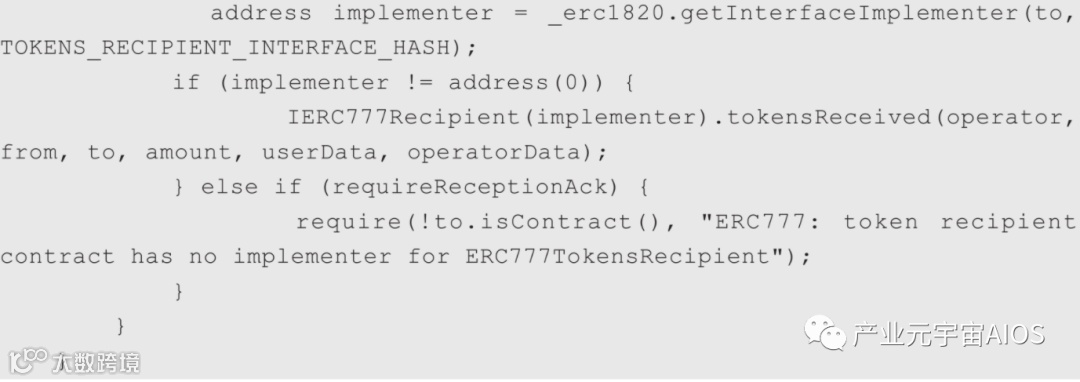 (2)如果接收者有通过ERC1820注册ERC777TokensRecipient实现接口,ERC777实现合约必须调用其tokensReceived()钩子函数。