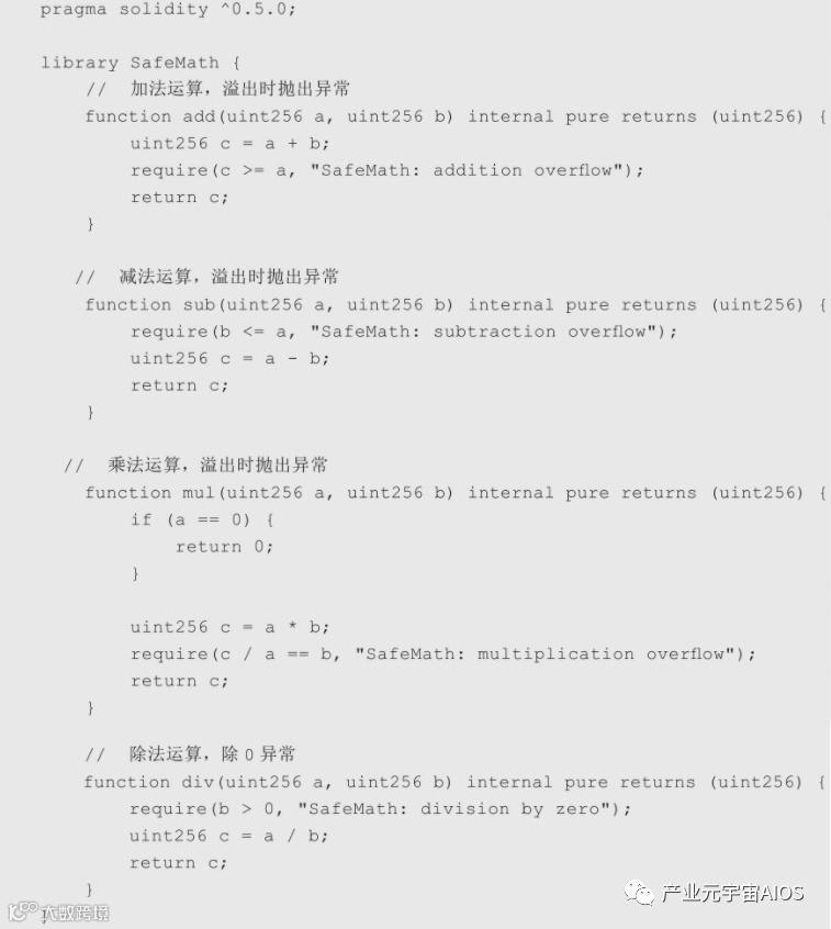 SafeMath针对256位整数进行加减乘除运算添加了额外的异常处理,避免整型溢出漏洞,SafeMath的代码如下: