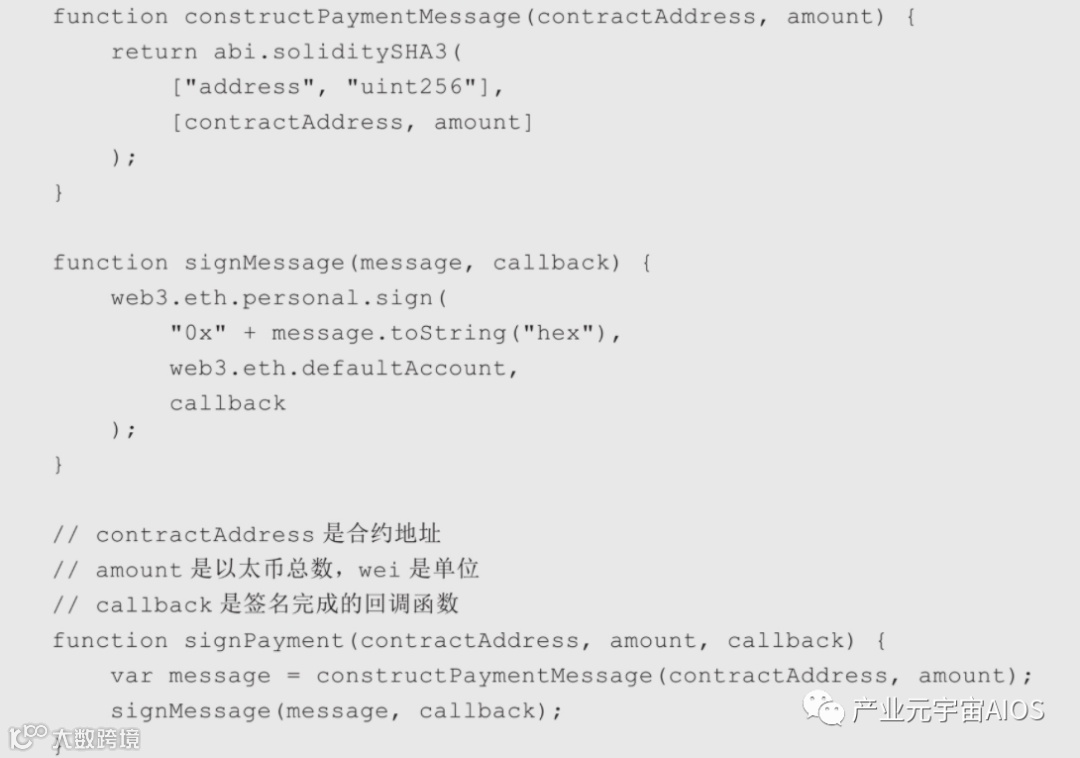 constructPaymentMessage函数使用了ethereumjs-abi库(代码:https://github.com/ethereumjs/ethereumjs-abi)的soliditySHA3用来进行信息拼接与哈希,signMessage函数使用Web.js的eth.personal.sign函数进行签名。