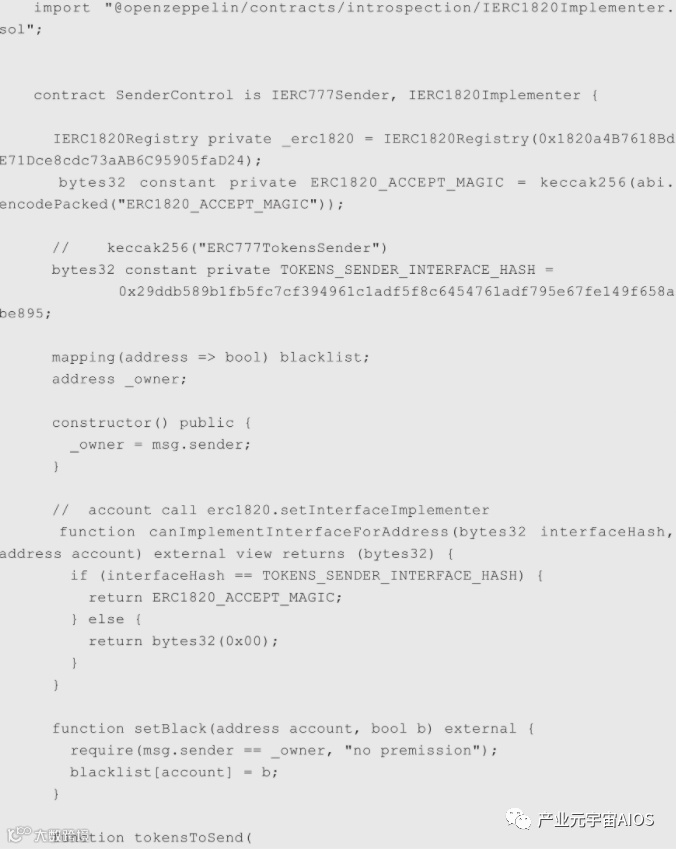 如果持有者想对发出去的代币有更多的控制,可以使用一个代理合约来对发出的代币进行管理,假设这样一个需求,如果发现接收的地址在黑名单内,转账进行阻止,来看看如何实现。根据ERC1820标准,只有账号的管理者才可以为账号注册接口实现合约,在刚刚实现ERC777TokensRecipient时,由于每个地址都是自身的管理者,因此可以在构造函数里直接调用setInterfaceImplementer设置接口实现,按照刚刚的假设需求,实现ERC777TokensSender有些不一样,代码如下: