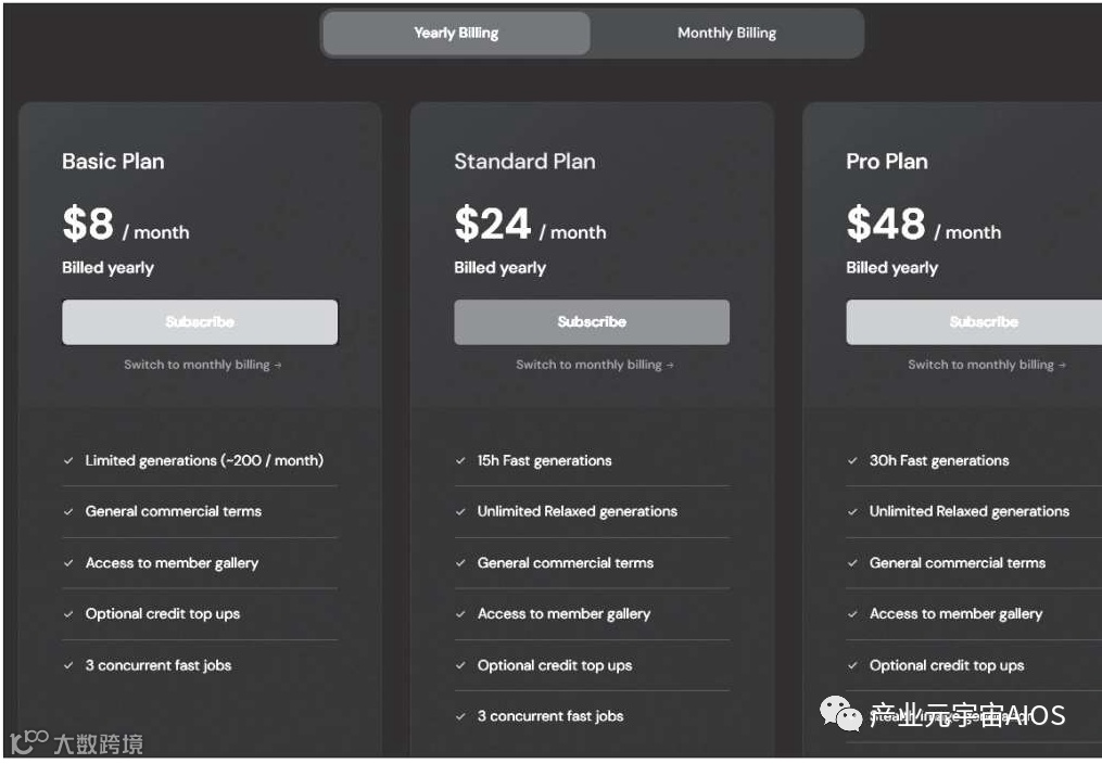 Q:Midjourney生成图片是免费的吗? A:新用户有25次的免费使用额度,用完后需要付费订阅,订阅计划分为3种。 基本计划(10美元/月):每月可以生成200张图片,适合轻度使用者。 标准计划(30美元/月):每月生成的图片数量无限制,每月15小时的fast模式使用时长。 专业计划(60美元/月):每月生成的图片数量无限制,每月30小时的fast模式使用时长。 这3种订阅计划如果按年付款,则可以享受8折优惠,如下图所示。 |