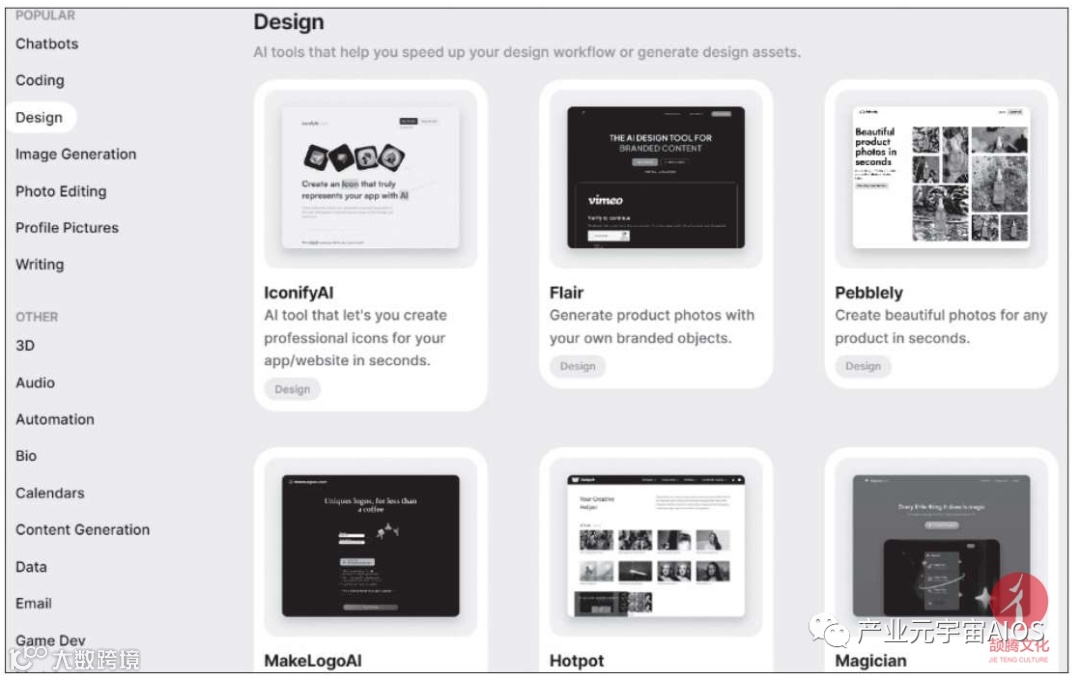 例如,选择该网站中的Design标签,则网页中会展示所有与设计相关的AI工具或服务,如下页图所示。