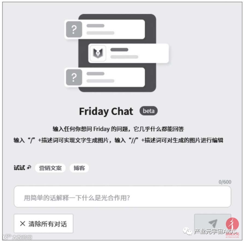 如果想以类似ChatGPT的“一问一答”的方式生成文字或图片,可以使用Friday Chat功能。其界面如下图所示。