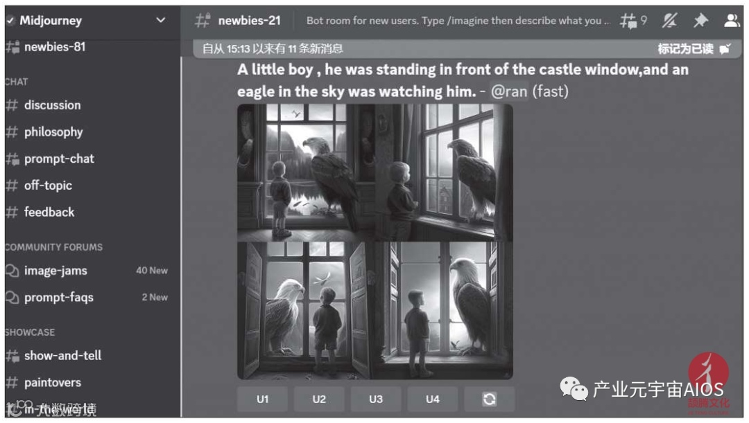 Midjourney归属于Discord(一个聊天室网站),它的基本使用方法就像跟人聊天一样,输入描述文字,然后单击发送按钮,即可生成图片。