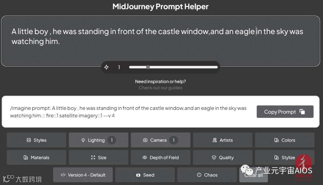 设置完毕后,单击“Copy Prompt”按钮,将带有参数代码的描述文字复制到剪贴板,再粘贴到Midjourney的聊天对话框中,即可生成相应的图片。