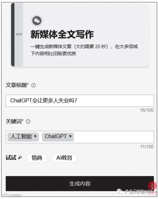 选择一种写作模板后,根据需求在页面左侧设置文章标题和关键词,再单击“生成内容”按钮,如下图所示。