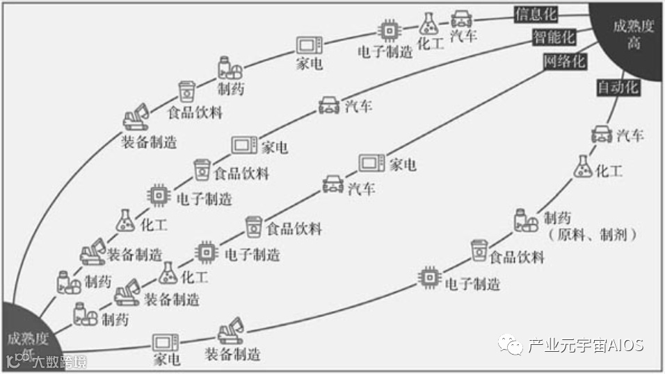 专业咨询机构埃森哲从工业“新四化”的维度对主要工业细分领域做了成熟度评估。