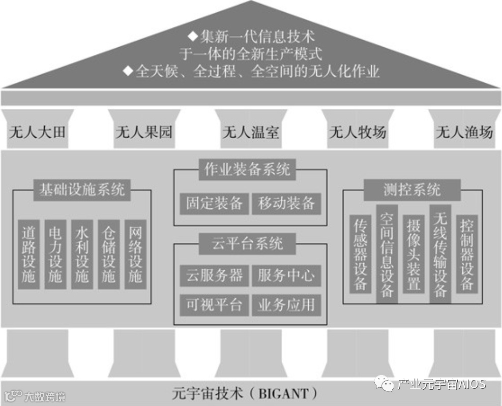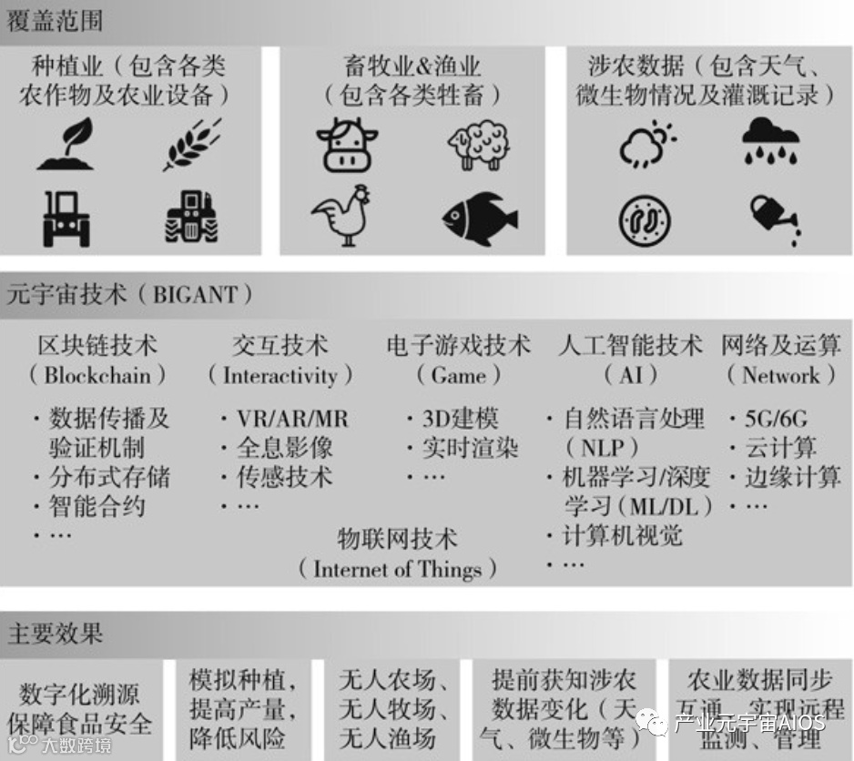 在此基础上,我们对农业元宇宙相关概念进行界定:农业元宇宙是指对于种植业、畜牧业、渔业等,所涉及的各类农作物、牲畜、农业设备、天气情况、灌溉记录、微生物情况和其他种植/养殖环境中的涉农数据变量,进行时间与空间的打破,消除产、学、研之间的信息孤岛,推动农业精准、智能、绿色发展,以实现农业精准预测及环境资源最优配置为最终目标。