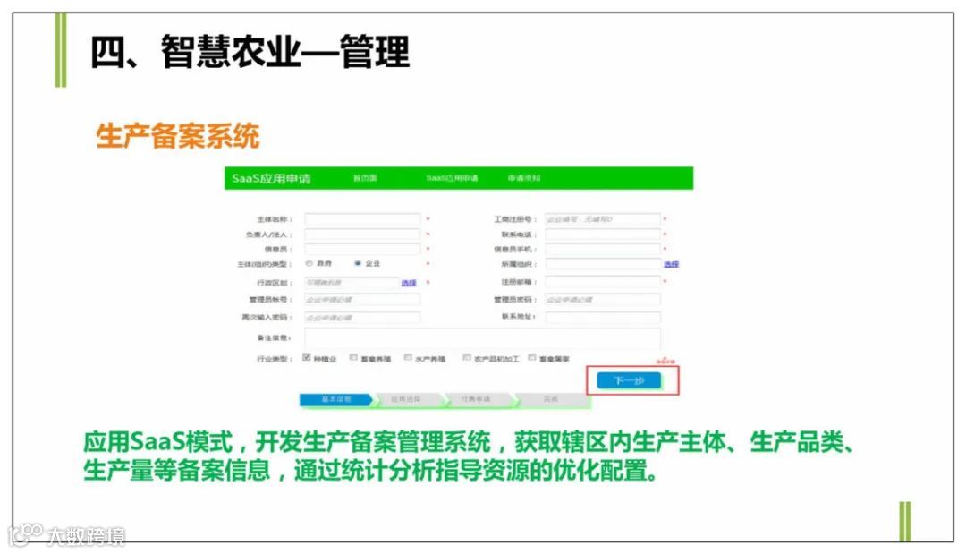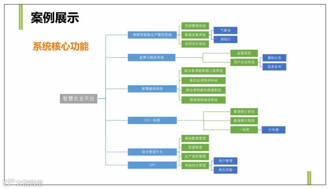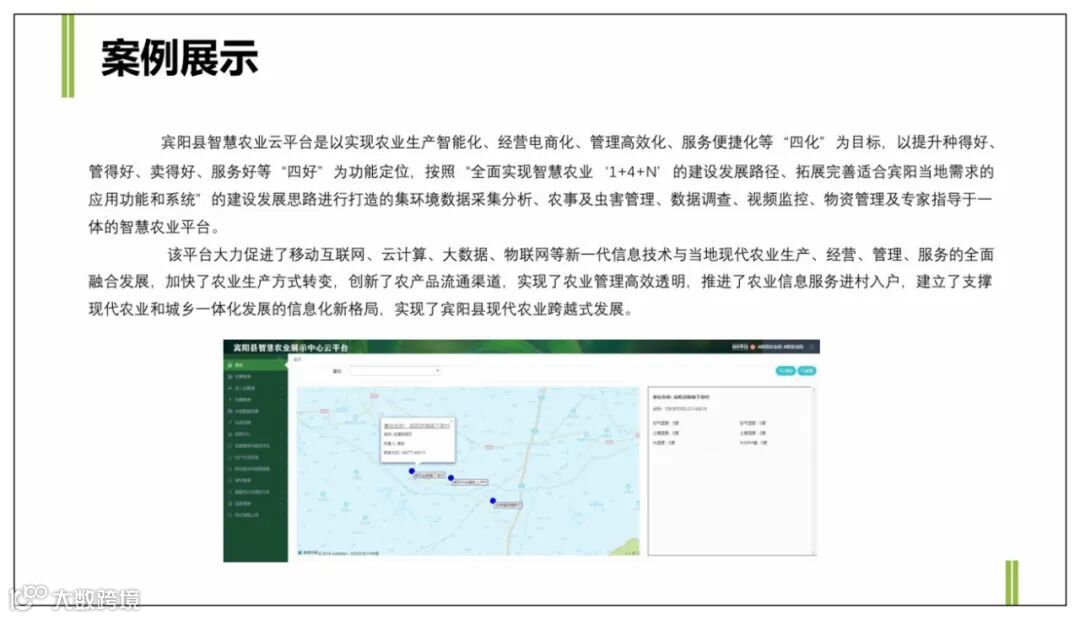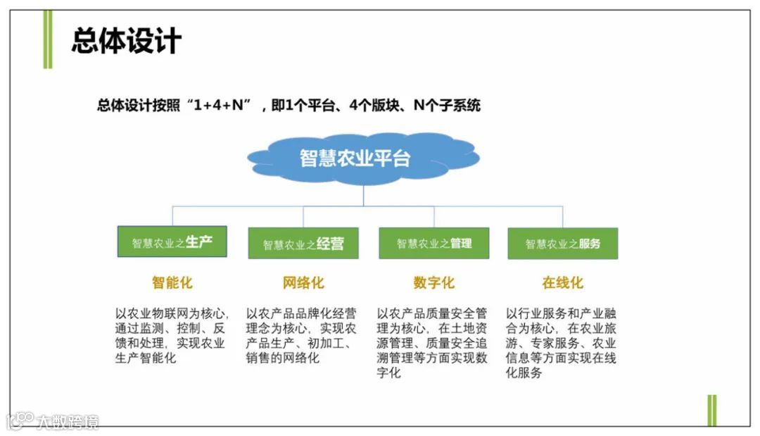 总体设计按照”1+4+N“,即1个平台、4个版块、N个子系统。即➀智慧农业之生产智能化:以农业物联网为核心,通过监测、控制、反馈和处理,实现农业生产智能化;➁智慧农业之经营网络化:以农产品品牌化经营理念为核心,实现农产品生产、初加工、销售的网络化;➂智慧农业之管理数字化:以农产品质量安全管理为核心,在土地资源管理、质量安全追溯管理等方面实现数字化;➃智慧农业之服务在线化:以行业服务和产业融合为核心,在农业旅游、专家服务、农业信息等方面实现在线化服务。