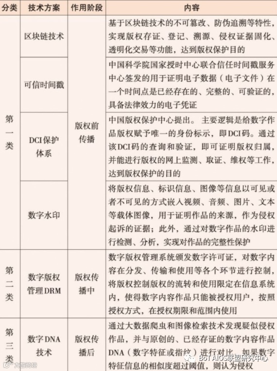 根据版权保护技术在版权传播周期中发挥作用的阶段,版权保护技术方案主要可以分为三类,分别是传播前、传播中和传播后阶段,具体而言是版权“生成”阶段、版权传播过程中阶段和版权传播后阶段。
