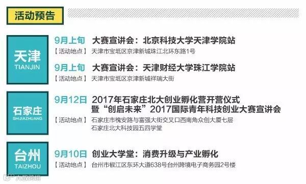 “创启未来”2017全球创新创业汇全面启动,活动将遍及北京、包头、金华、天津、石家庄、西安、台州、郑州、香港、首尔、西雅图、波士顿、硅谷等地。作为创新创业汇的核心活动,“创启未来”2017国际青年科技创业大赛正面向全球征集优秀创业项目。更多信息及报名详情请关注活动官方网站: