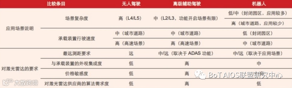 因为使用场景和搭载激光雷达的载体(无人驾驶汽车、乘用车、机器人等)具有明显差异,这些市场对激光雷达的性能、价格、体积等维度提出了不同的需求。