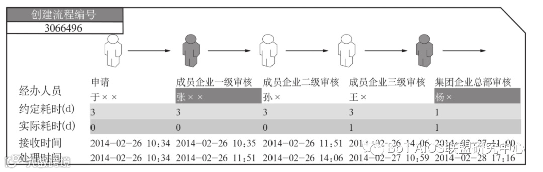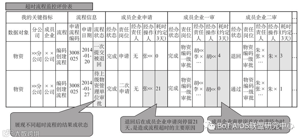 针对超时流程,进行详细流程耗时情况分析,可追溯到具体责任人。2014年1月20日首次申请创建编码时,成员企业一审经办操作人约定耗时应该是3天,但实际是4天才完成;成员企业二审经办操作人在约定时间内退回该申请,申请人与2014年1月27日进行二次申请,约定耗时为3天,实际是21天才完成。这两次创建都是超时流程。